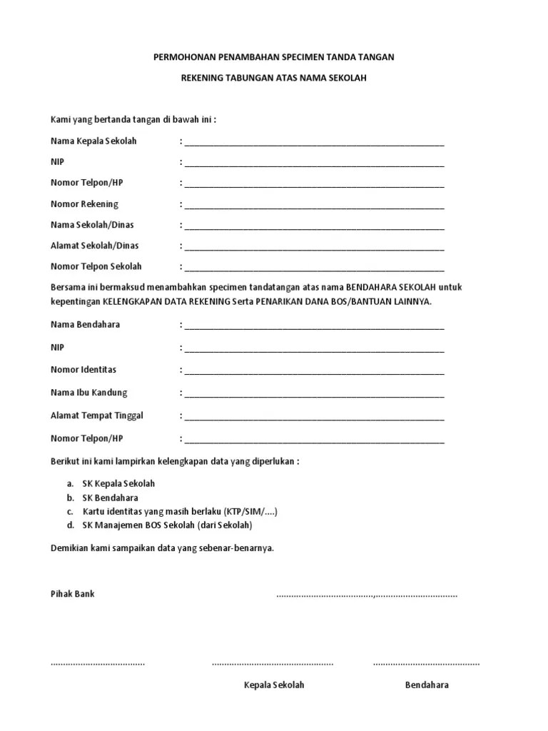 Demikian surat permohonan perubahan speciment ini kami sampaikan untuk dapat digunakan sebagai mestinya. surat permohonan pindah sekolah sekolah surat kepala sekolah. Contoh surat permohonan cetak rekening koran ke bank bjb. Data lengkap tentang contoh surat permohonan perubahan specimen tanda tangan bank mandiri. Contoh surat kuasa di bank bri contoh surat kuasa cetak buku tabungan di bank bukopin contoh surat kuasa class action untuk berbagai keperluan post date.